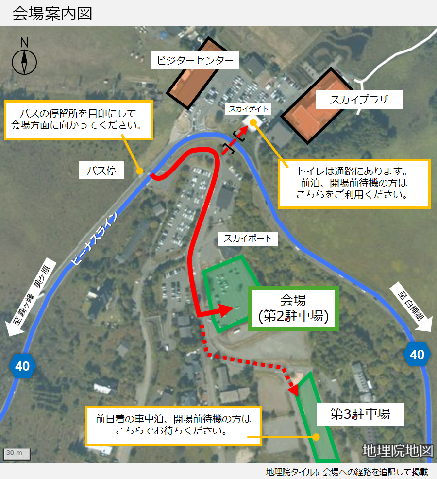 - 会場ではスタッフの誘導にしたがって移動・駐車をお願いします。指定外の場所への移動・駐車はご遠慮ください。