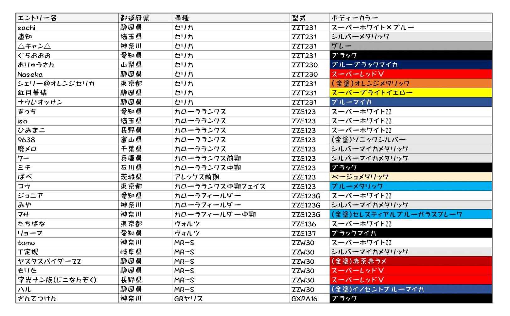 1ZZ2ZZ Lights 2023 in 朝霧高原 1zz2zzスピンオフ企画開催規模が半分のライツ開催! Organizer コゥ (COROLLA RUNX ZZE123) 開催要項 日時 2023年10月29日 (日)雨天決行 (荒天時は以下の通り)荒天時は前々日までに開催の有無を判断してお知らせします。社会情勢の変化や関係機関からの要請によって、開催直前に中止となる場合があります。参加を予定されている方は随時、開催情報をご確認いただけますようお願い申し上げます。 場所 朝霧高原もちや静岡県富士宮市猪之頭1114-1http://www.mochiya.co.jp/access.html開催にあたっては、利用施設より駐車場利用の許可を得ております。本オフ会に関するお問い合わせは、お問い合わせフォームよりお願いいたします。 募集台数 50台 (車種の内訳は下記の通り) 受付期限2023年10月22日 (日)定員に達し次第、受付を締め切ります。内訳は目安であり、申込状況によって主催の調整が入る可能性があります。 (直近のイベント開催状況を踏まえカローラ系は多く設定) 20 台 – ランクス、アレックス、フィールダー 10 台 – セリカ 10 台 – MR-S 10 台 – 他1ZZ/2ZZ搭載車種、ギャラリー参加 参加には、事前に申し込みが必要です。本ページ内の禁止・注意事項を確認の上、申し込みフォームからお申し込みをお願いします。 参加費 300円/台参加費は、当日に受付にてお支払いください。 開催スケジュール 受付開始 10:00開会 11:00昼食・自由時間 11:00-15:00閉会 15:00撤収 16:00 受付開始直後の入場は混雑や渋滞が予想されます。搬入待ちで渋滞しないよう、時間差での来場にご協力をお願いします。また、一般のご利用者様へのご迷惑となるため、受付開始時間より前に会場または周辺での待機は禁止とします。うまく時間を調整して受付開始後の到着となるようにお願いします。 禁止行為 以下の行為は禁止といたします。 不特定多数に向けた物品の販売や譲渡(名産品等、持参した手土産を配ることは可)エンジンの空ぶかし音量の大小にかかわらずカーオーディオ等の音響機器の使用タイヤ交換、塗装、部品の取り付け等のメンテナンスドローンを利用した空撮その他、主催者が不適切と判断した行為 もちやが禁止としている以下の行為違法改造車両の乗り入れ。イベント参加以外の一般のお客様に迷惑のかかる行為全般。(大声での会話・騒音・迷惑行為等)参加者に対して飲酒運転につながる様な行為。二輪・四輪車その他乗り物の実車オフにおけるジムカーナ等の競技や練習走行・実技講習の類。もちやの許諾なしに駐車場等のスペースを占有すること。(今回50台の許諾です)イベント参加者およびスタッフ等による飲食料品の販売行為。もちやの駐車場および建物施設等を汚損するおそれのある行為。その他公序良俗に反する行為、不適当と見なされる行為全般。 発見時には注意の上、退場とし、場合によってはオフ会そのものを中止いたします。その他、他人が迷惑を感じる行為もおやめください。みなさまが気持ちよく参加できるようご協力をお願いいたします。 注意事項 参加にあたっては、以下の注意事項をお守りください。 会場ではスタッフの誘導にしたがって移動・駐車をお願いします。指定外の場所への移動・駐車はご遠慮ください。会場内および道中における事故やトラブルについて、主催者および施設管理者による責任は負えませんので、走行には十分ご注意ください。会場までの道のりにおいては住宅地があります。ギアを落としての大音量での走行は避け、静かに来場・退場するようお願いいたします。ゴミはポイ捨てせず、各自で持ち帰りをお願いいたします。喫煙は所定の喫煙スペースでお願いいたします。 撮影について 本オフ会の参加車は写真撮影され、当 Web サイト上、または参加者によって Web サイトや SNS サイトに掲載される場合があります。撮影を望まない方は恐れ入りますが参加を見合わせていただくようお願いします。現在はナンバープレート情報のみでは容易に所有者を照会できないことから、撮影した車両のナンバープレートのモザイク処理は原則として任意とする方針といたします。映り込みを気にされる方は、必要に応じて各自でナンバープレートにカバーをするなどの対策をお願いします。 申し込み 本イベントへの申し込みは、以下のフォームより必要事項を入力の上、送信をお願いします。参加受付は締め切りました。 参加車リスト